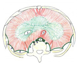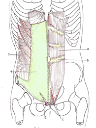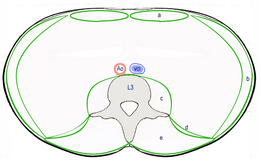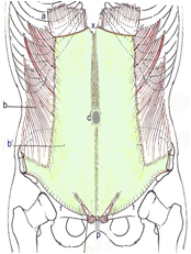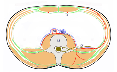 squelette lombaire, elles dŽlimitent des loges occupŽes par les muscles grands droits (a) les