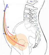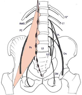 infŽrieur. _______________________________ AbdG : nerf abdomino-gŽnital (1¡ nerf lombaire) / Cru : nerf crural Fc : nerf fŽmoro-cutanŽ / L5 : 5¡ vertbre lombaire / Obt. : nerf Obturateur PL : Plexus Lombaire / Ps : Psoas