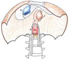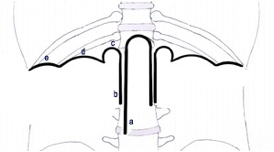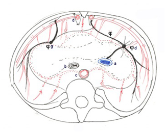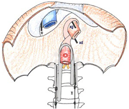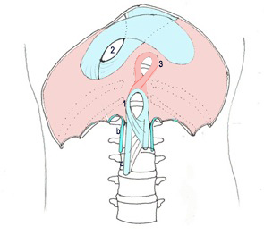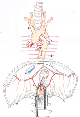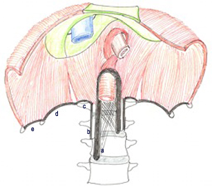 la veine cave inf. / b : orifice hiatal / c : orifice de lÕaorte / d : fente de Larrey