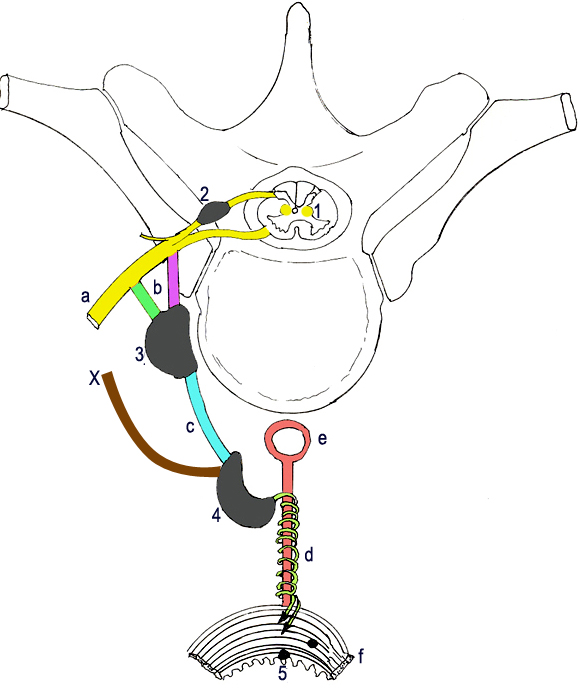 nerf Pneumogastrique a : nerf rachidien / b : rameaux communicants / c: fibres prŽ ganglionnaires d : fibres post ganglionnaires / e : branche de lÕaorte / f :