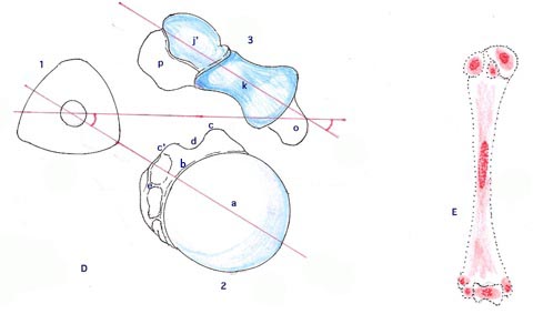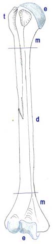 lĠhumrus. Il est fait dĠun long tube ou diaphyse (d) interpos entre deux extrmits pleines ou piphyses (e) ; la zone de transition avec la diaphyse